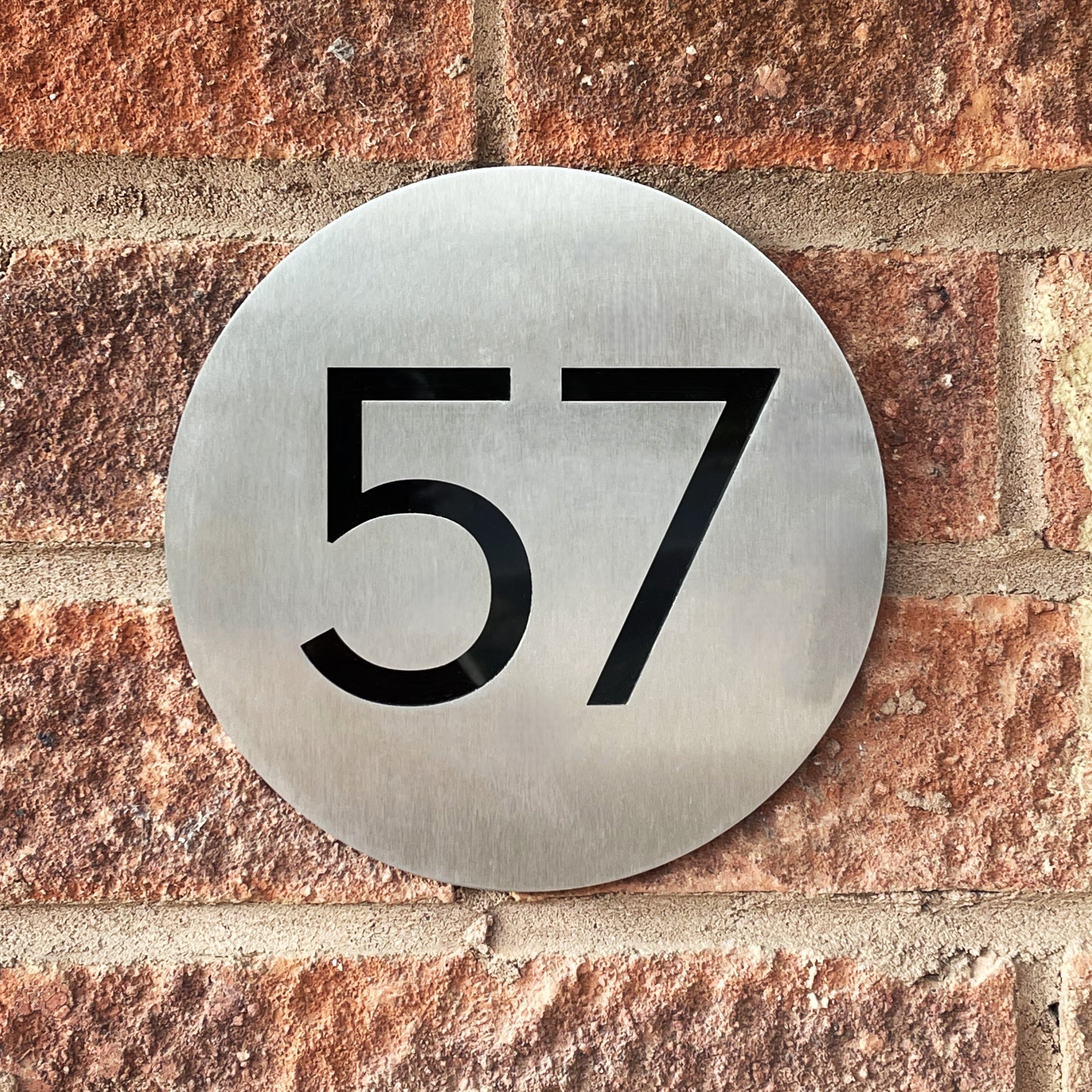 Circular house number plaque featuring the famous font 'Neutra Face'. This font was founded on principles of geometric perfection and is iconic in its numbers which are positioned off centre when paired up. If you would like to see an image of how your number combination is positioned before ordering then simply contact us. You are welcome to request that the numbers are aligned instead of offset when you place your order.