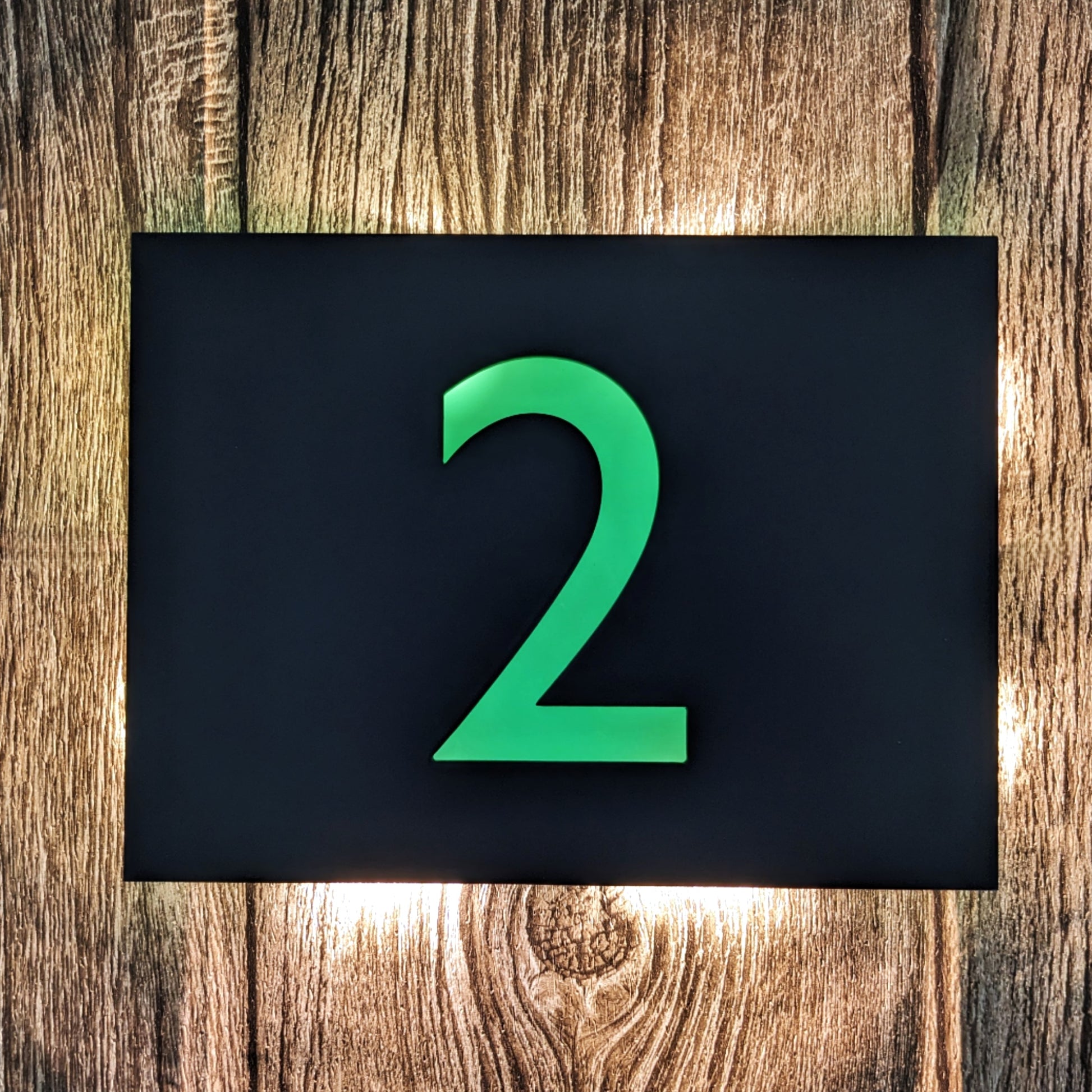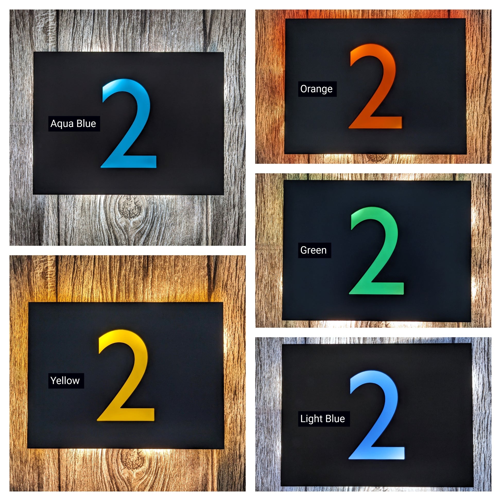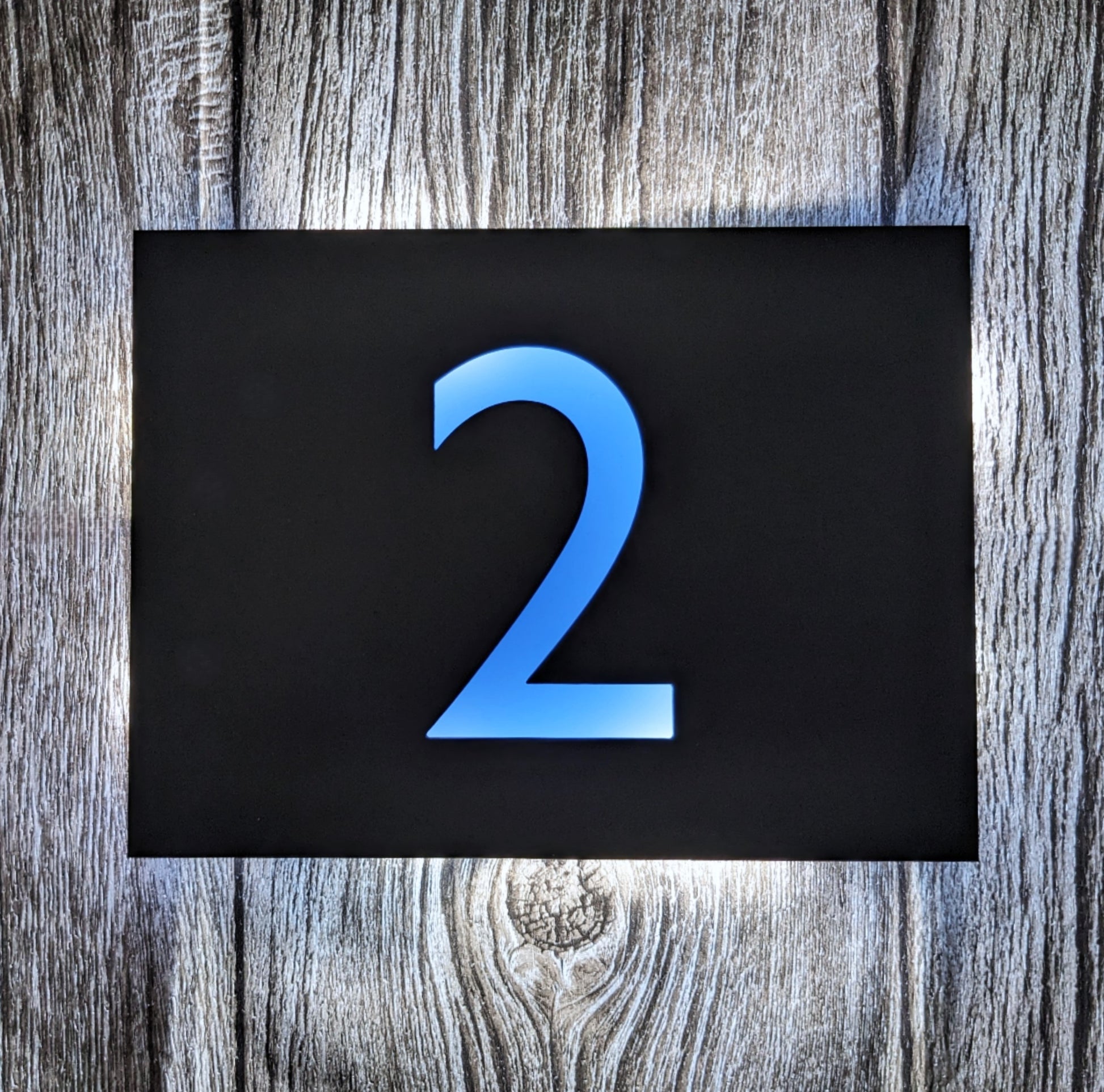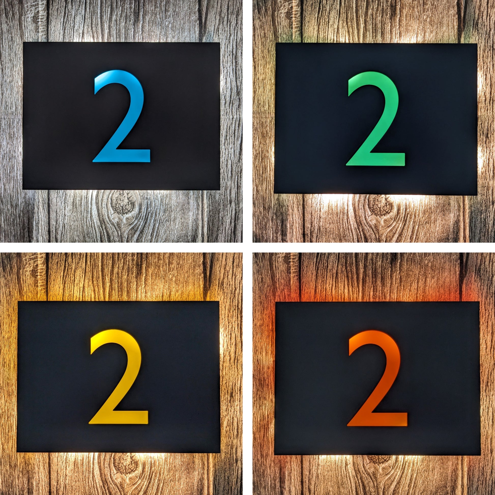 Made to order LED house number plaques in Gill Sans font, with custom colour backing plates to make the LEDs glow with colour! These are bespoke, high quality products designed and assembled here in the UK.