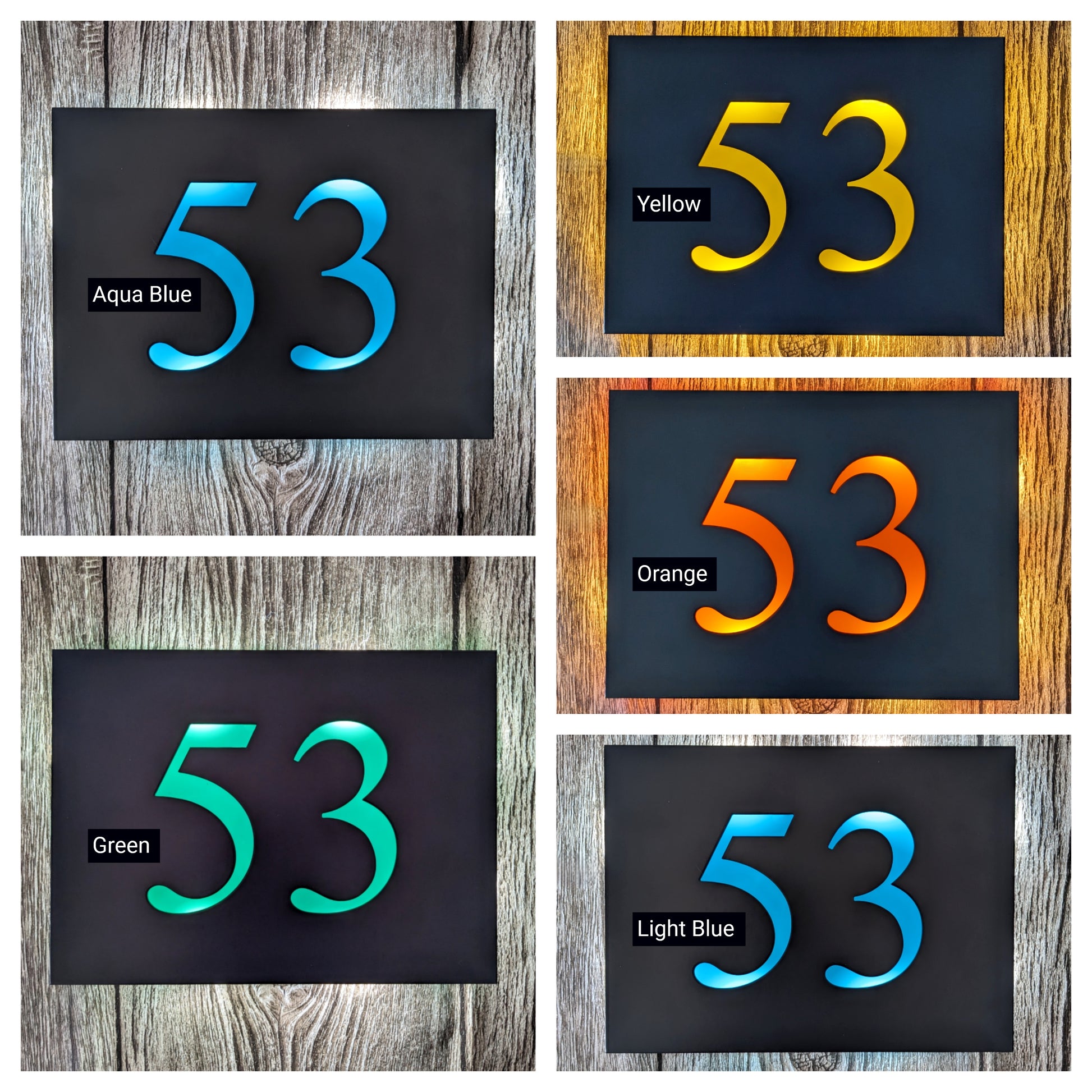 Made to order LED house number plaques in Times New Roman font, with custom colour backing plates to make the LEDs glow with colour! These are bespoke, high quality products designed and assembled here in the UK.