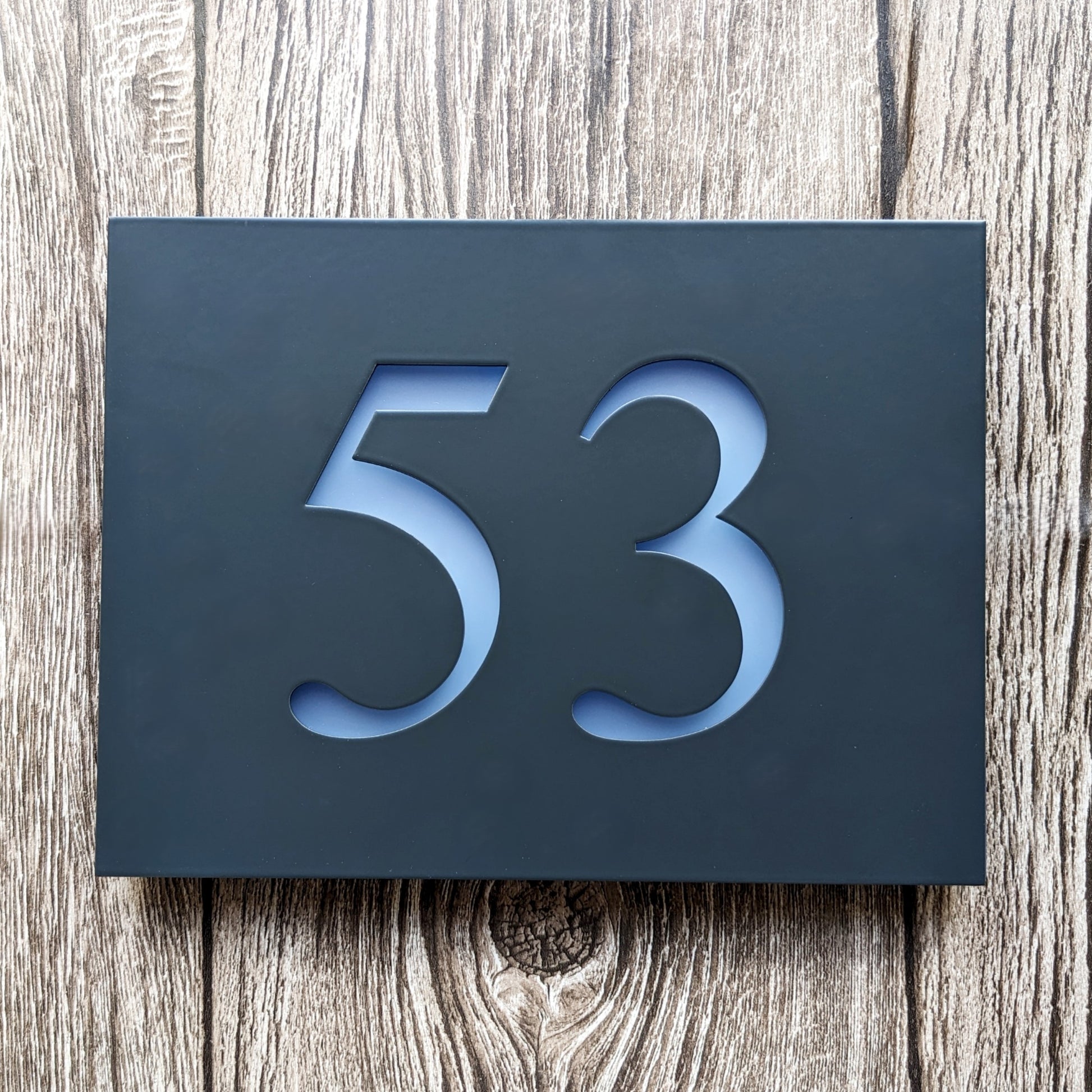 Your house number plaque will be laser cut from 304 grade 3mm thick brushed stainless steel or 3mm acrylic, with a 5mm coloured frosted acrylic backing plate, and high quality long lasting LED units. You can also select a powder coating for an architectural grade finish in anthracite grey or black which is applied over the stainless steel. The acrylic comes in a choice of matt black or matt charcoal grey.