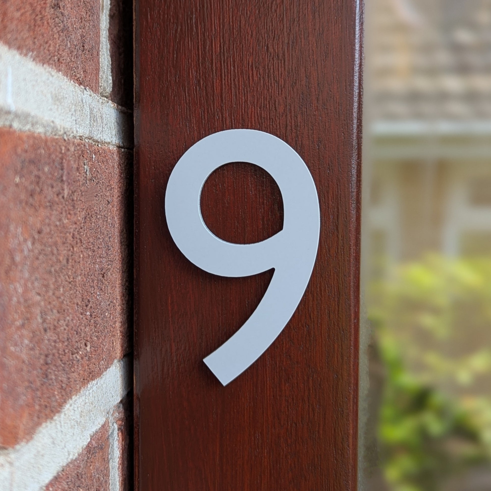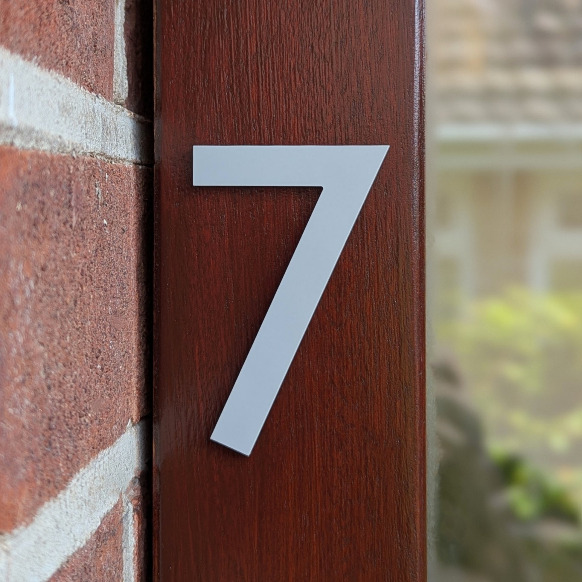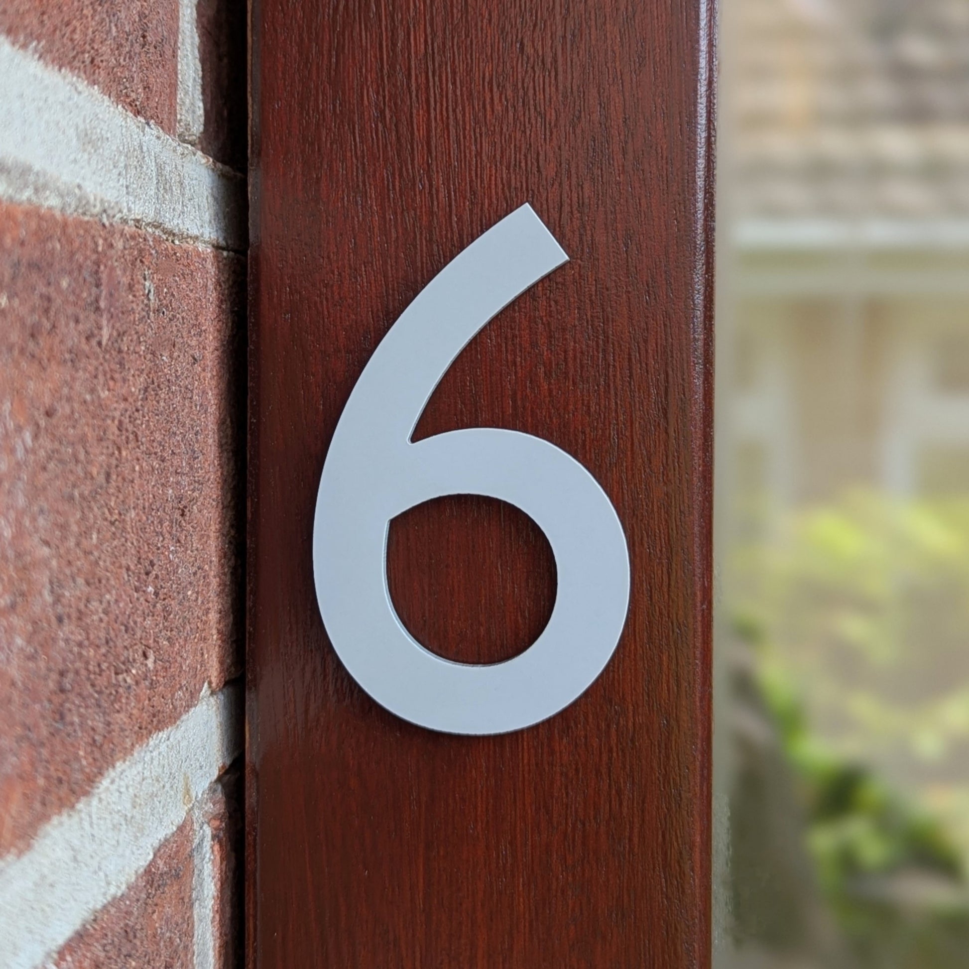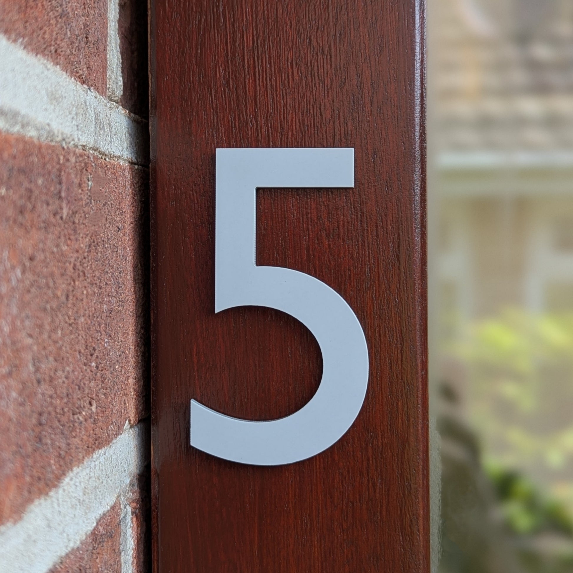 Modern matt ash grey acrylic door numbers in the modern font Gill Sans at 75mm high, 95mm high or 150mm high. This material is a beautiful matt finish, 3mm thick, and looks very modern. The grey tone is a pale grey, and looks fantastic on dark wood or darker door colours. These modern door numbers are a great size for installation straight onto the door.