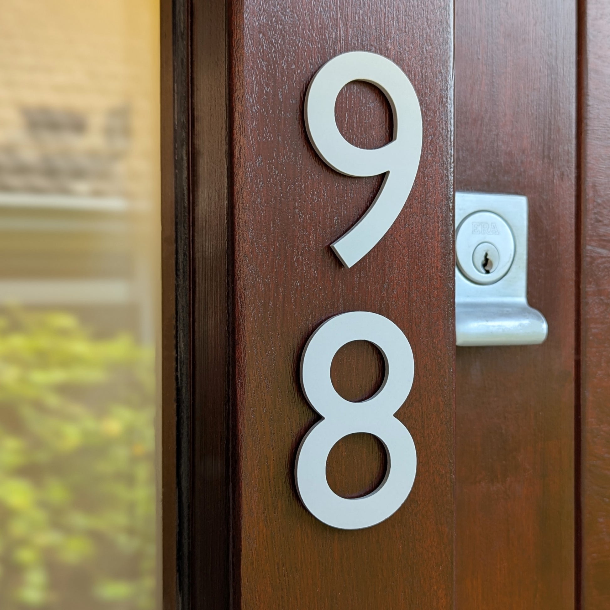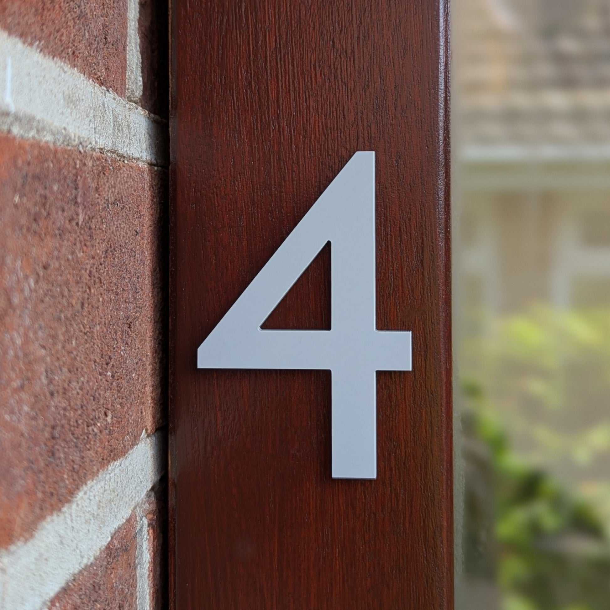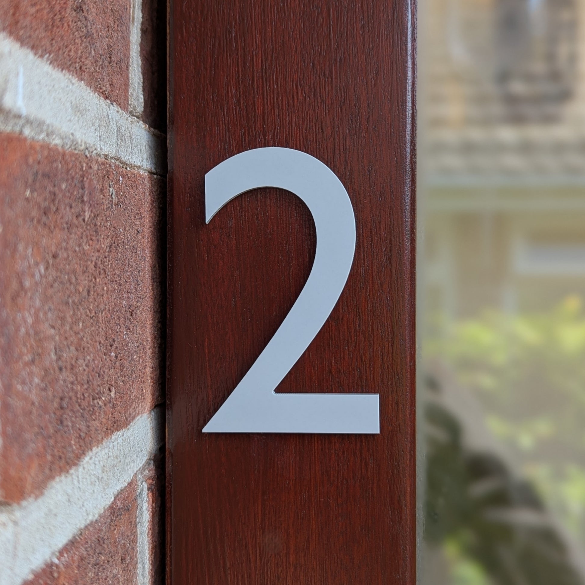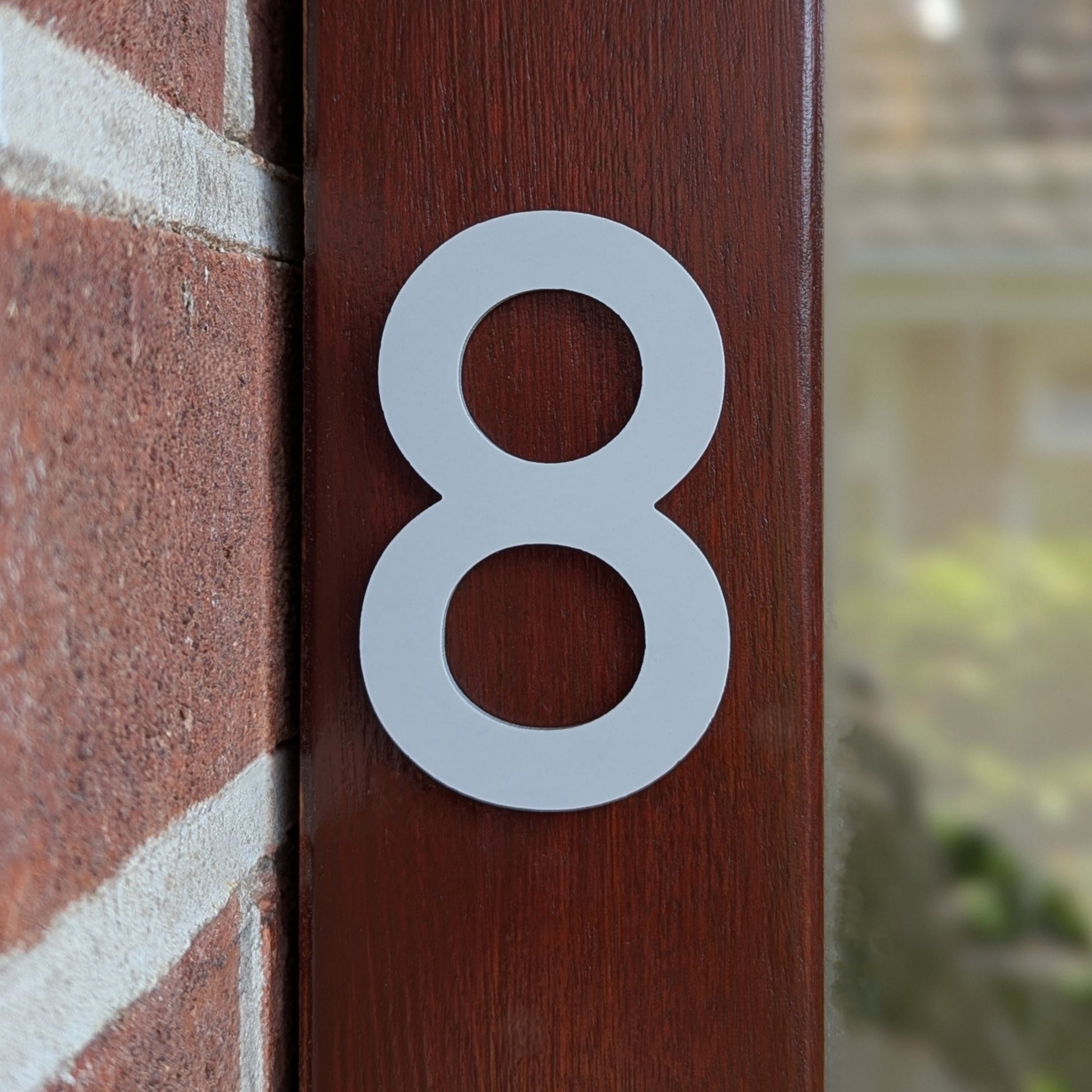 Modern matt ash grey acrylic door numbers in the modern font Gill Sans at 75mm high, 95mm high or 150mm high. This material is a beautiful matt finish, 3mm thick, and looks very modern. The grey tone is a pale grey, and looks fantastic on dark wood or darker door colours. These modern door numbers are a great size for installation straight onto the door.
